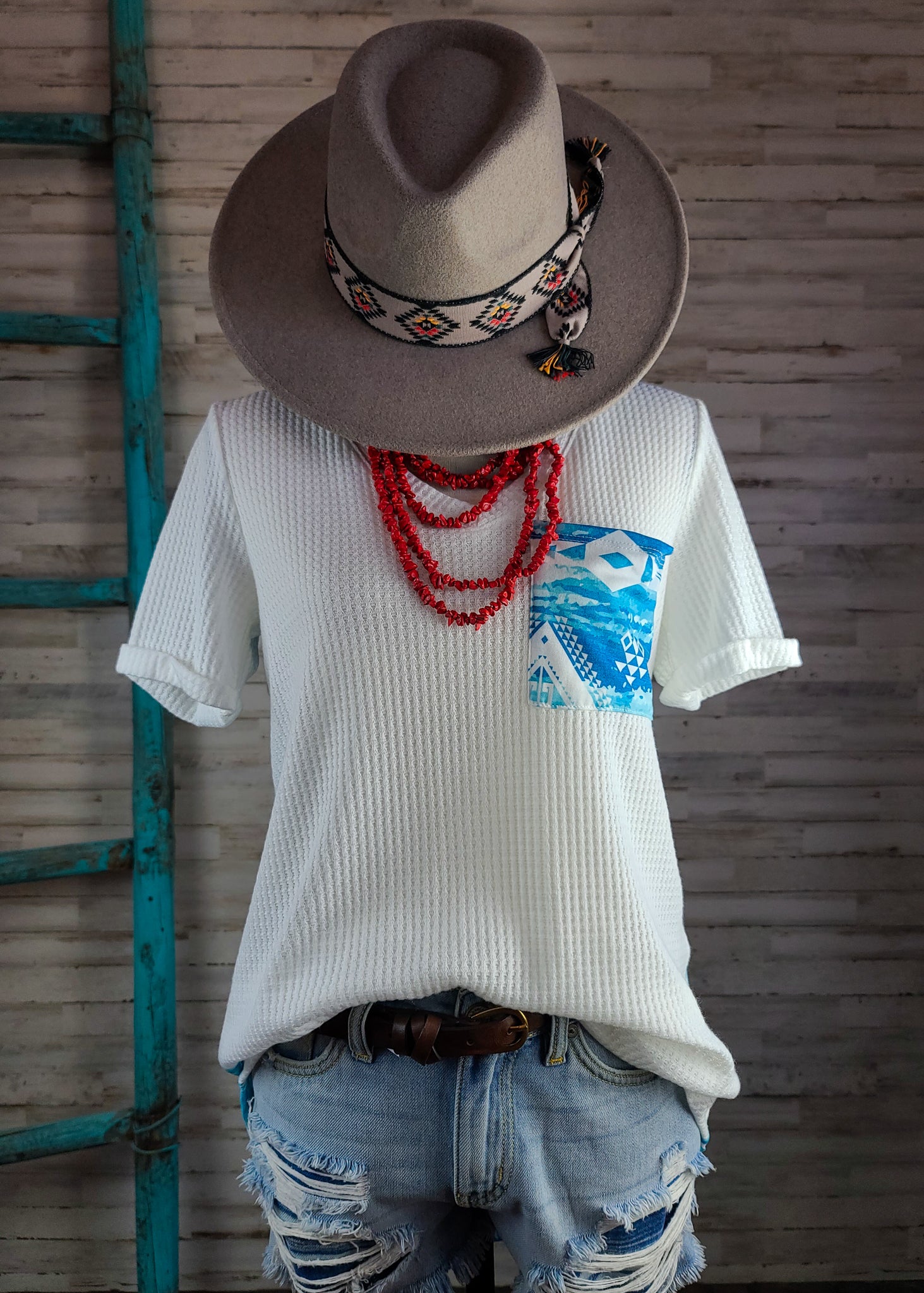 Unleash your unique style with our Aztec Turquoise V Neck Waffle Top! The beautiful blend of turquoise and ivory adds a pop of color to any outfit, while the v-neck design creates a flattering silhouette. Stand out from the crowd and show off your fashion sense with this must-have top!