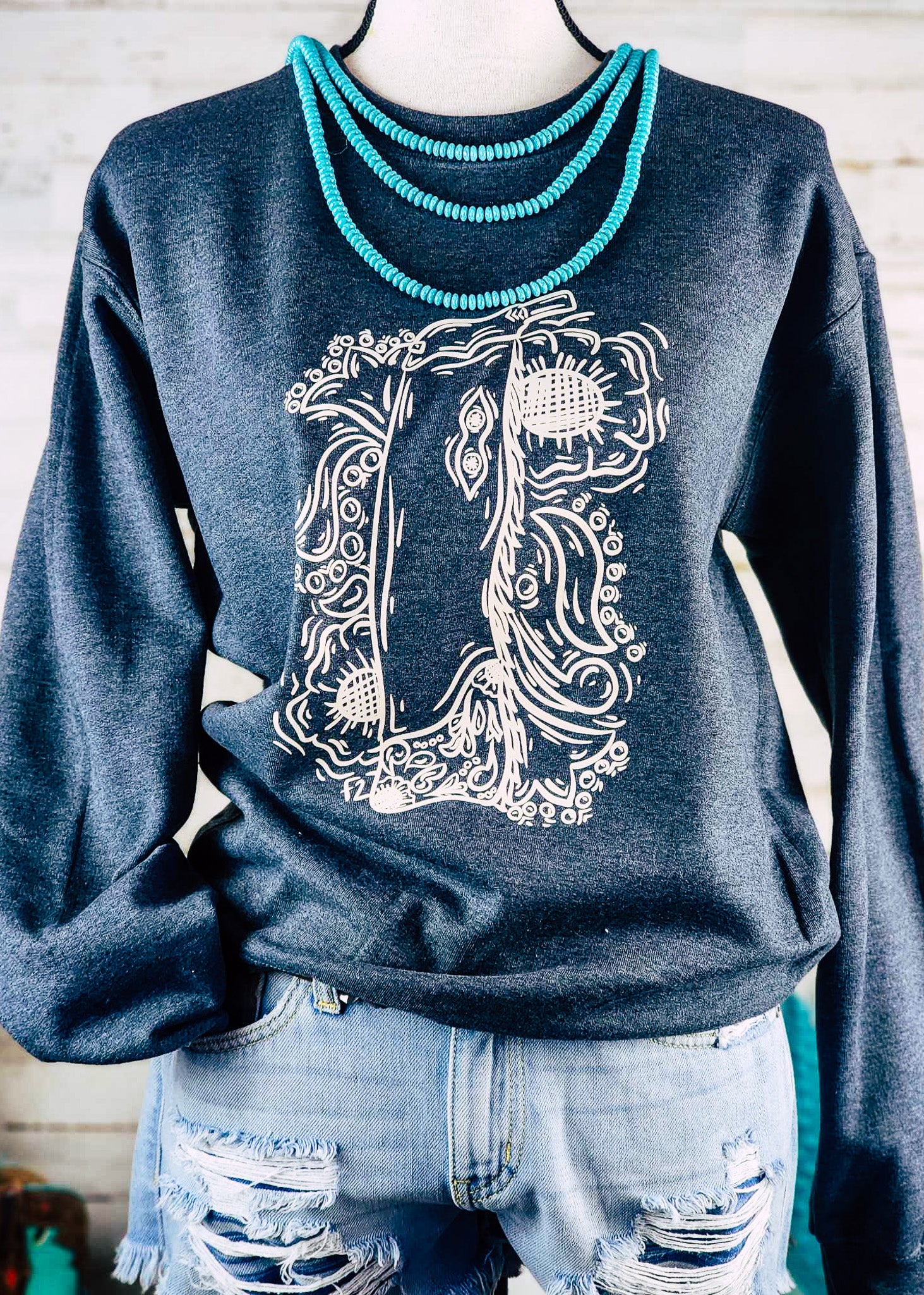This Dark Gray Floral Chaps Sweatshirt is the perfect combination of comfort and style. It has a classic western design and is lined with soft, cozy fleece fabric. Show off your cowgirl spirit in this bold and comfortable sweatshirt!