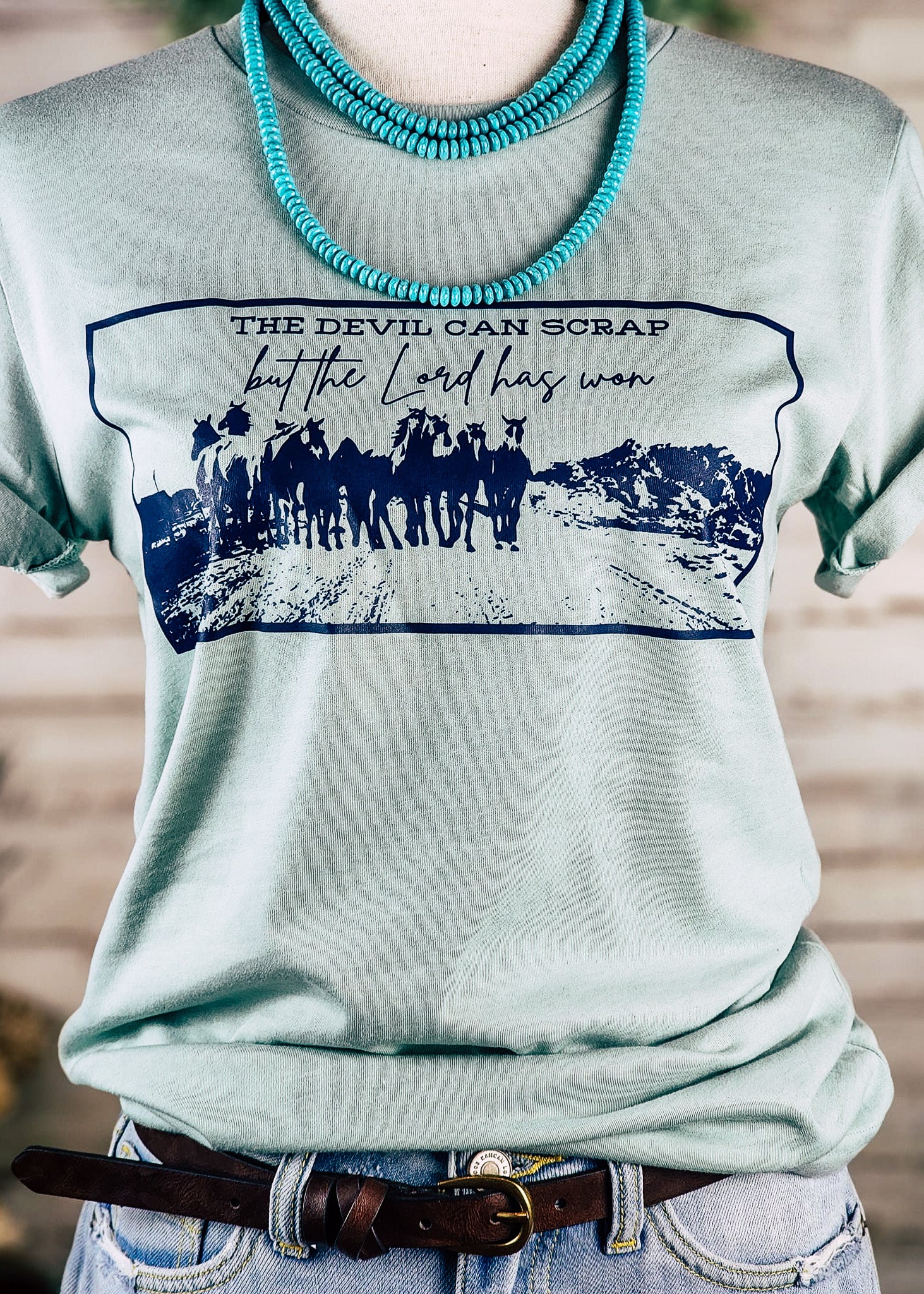Be inspired and stand out with our Dusty Blue The Devil Can Scrap Short Sleeve Tee. Show your faith without sacrificing comfort, this tee is perfect for any occasion! Feel inspired and confident in your look with this stylish and comfortable tee.