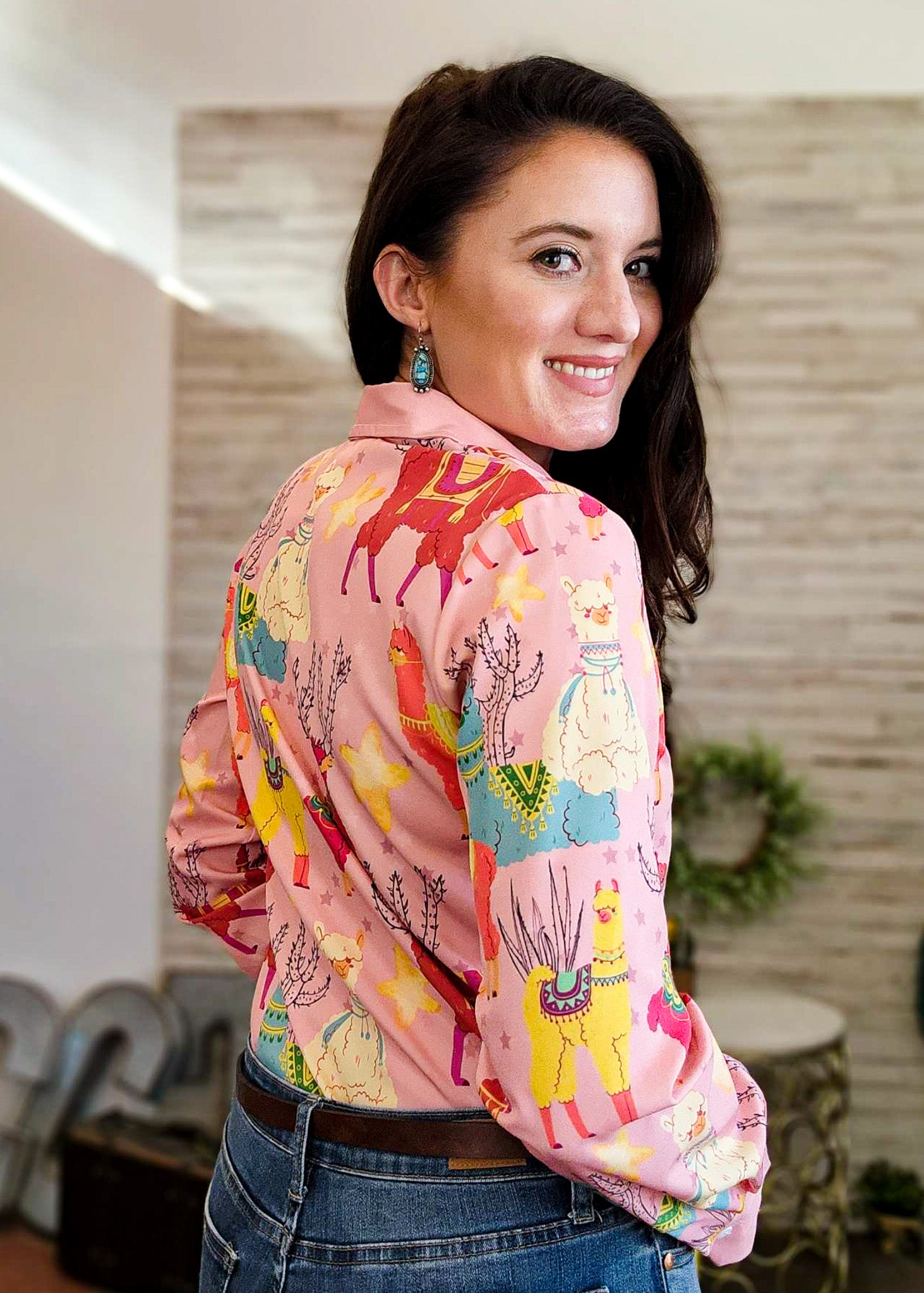 Wear a rodeo-inspired look with our Llama & Cactus Long Sleeve Button Down. The vibrant print features llamas and cacti design that is sure to add a unique flare to your wardrobe. Perfect for cowgirls who want to make a fashion statement!
