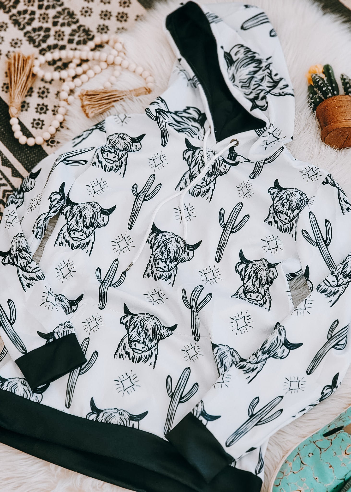 Stay cozy and stylish with our highland cow hoodie from The Cinchy Cowgirl! Featuring a relaxed fit and soft cotton material, this western-inspired hoodie is perfect for chilly days out on the ranch or running errands around town. The adorable highland cow graphic adds a playful touch to any outfit.