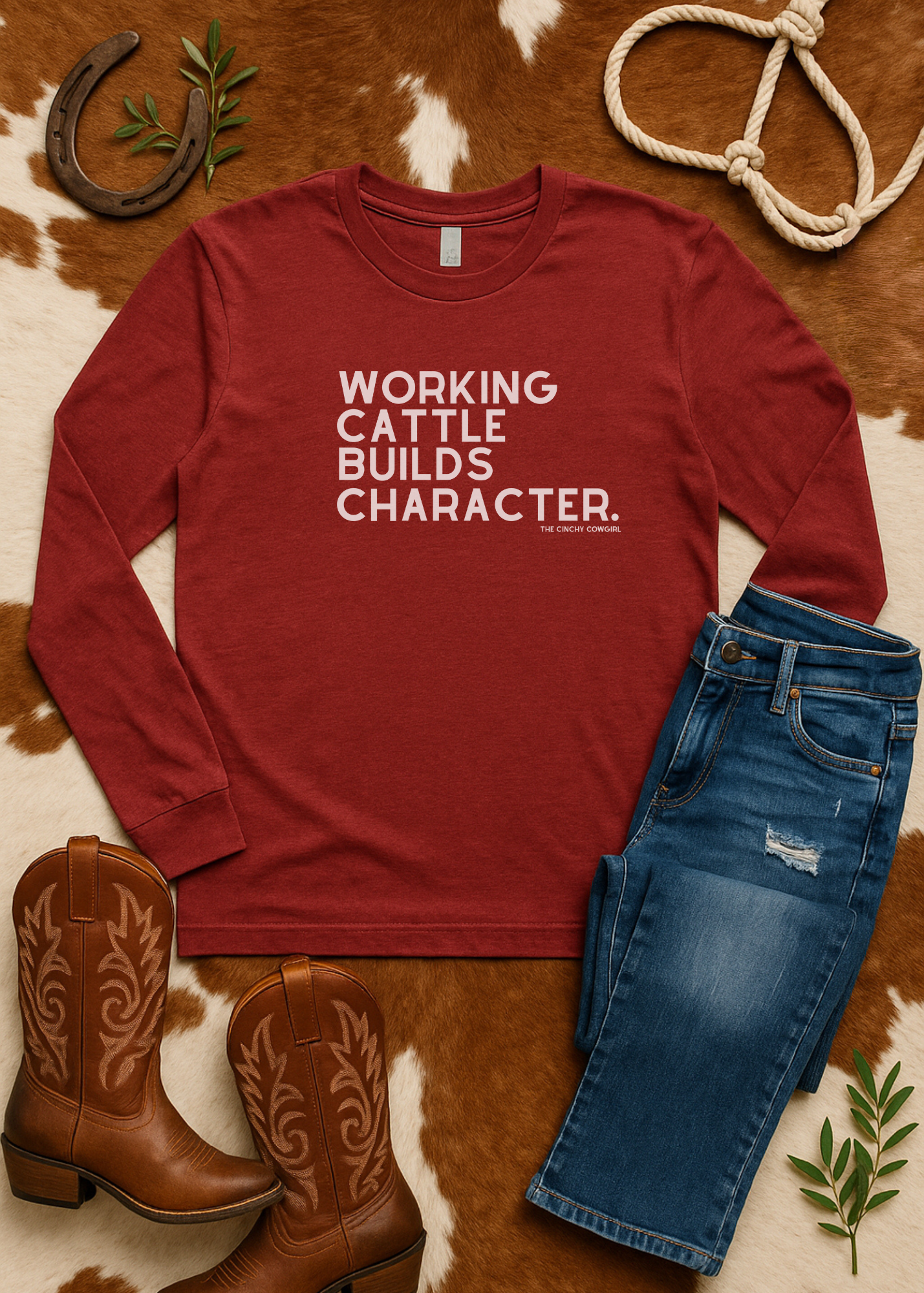 Working cattle isn't just a job—it's a lifestyle that shapes who you are. This long sleeve graphic tee celebrates the grit, determination, and character-building moments that come with ranch work. Featuring a bold, eye-catching design, it's perfect for wearing around the barn, at the feed store, or anywhere you want to show pride in your cowgirl heritage. Available in six versatile colors, this tee pairs comfort with authentic Western spirit. Whether you're a seasoned rancher or someone who appreciates the values of hard work and resilience, this shirt speaks to the strength within you.