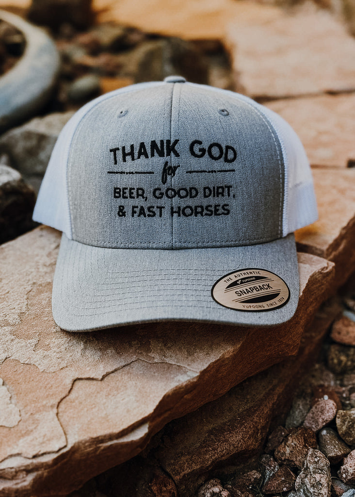 Gray Thank God For Beer, Good Dirt & Fast Horses Trucker Hat