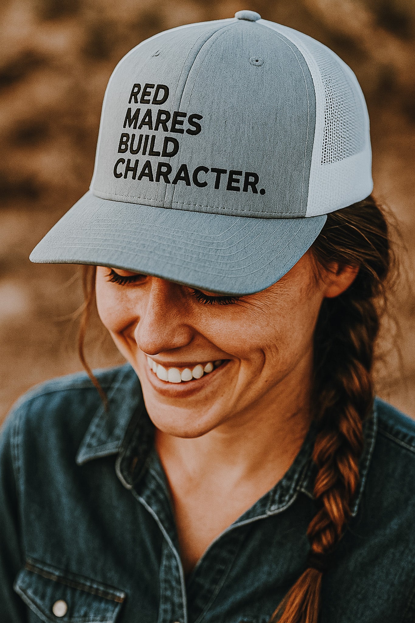 Show off your sass and protect yourself from the sun with the Embroidered Gray Red Mares Build Character Trucker Hat. Featuring bold embroidery and a splash of barn humor, this hat keeps you cool and shaded while adding personality to every ride or chore. Perfect for those who know that a little attitude and some sun protection go hand in hand—wear it proud and let the world know red mares build character!