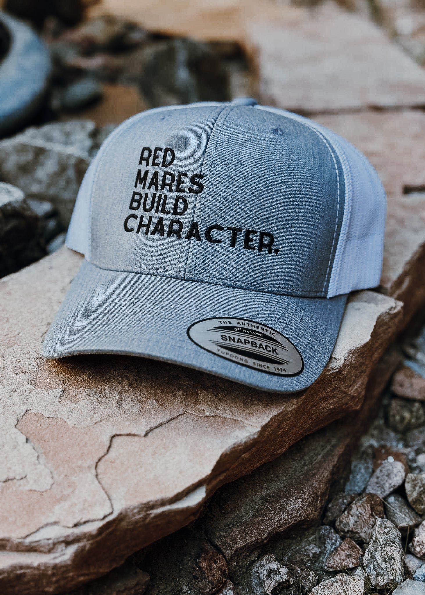 Gray Embroidered Red Mares Build Character Trucker Hat