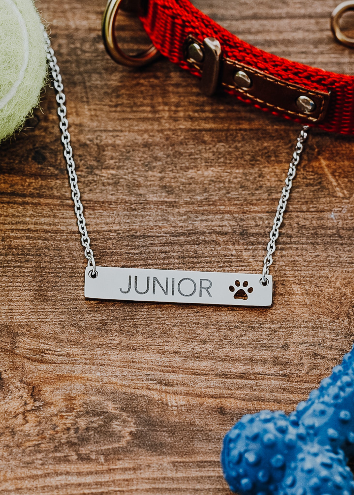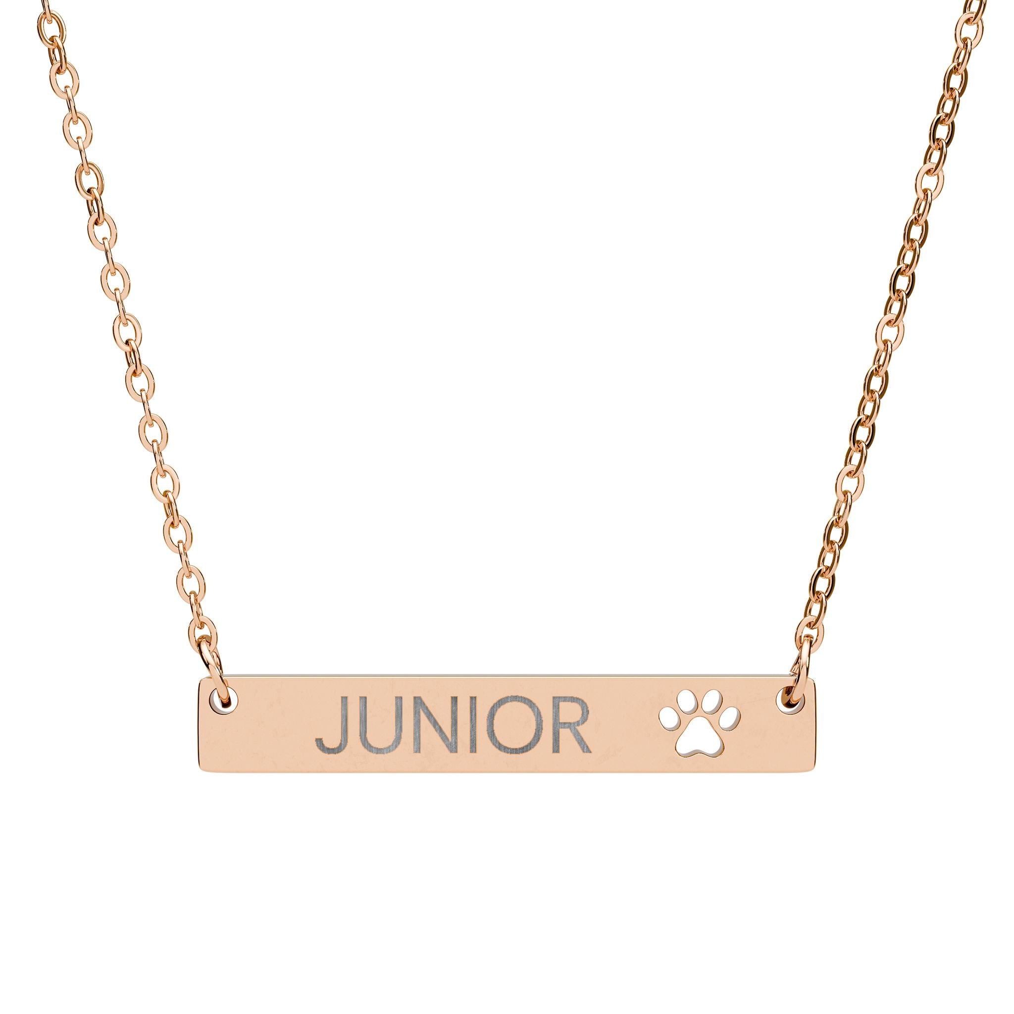 Celebrate your furry best friend with this charming personalized necklace. Featuring a delicate paw print paired with your dog's name, this petite bar design sits gracefully at your neckline—perfect for dog lovers who want to carry their beloved companion close to their heart. The trendy, minimalist style works beautifully with any outfit, making it an everyday essential or a meaningful gift for fellow pup parents. Show your devotion in style with this sweet, wearable tribute to the four-legged love of your life.