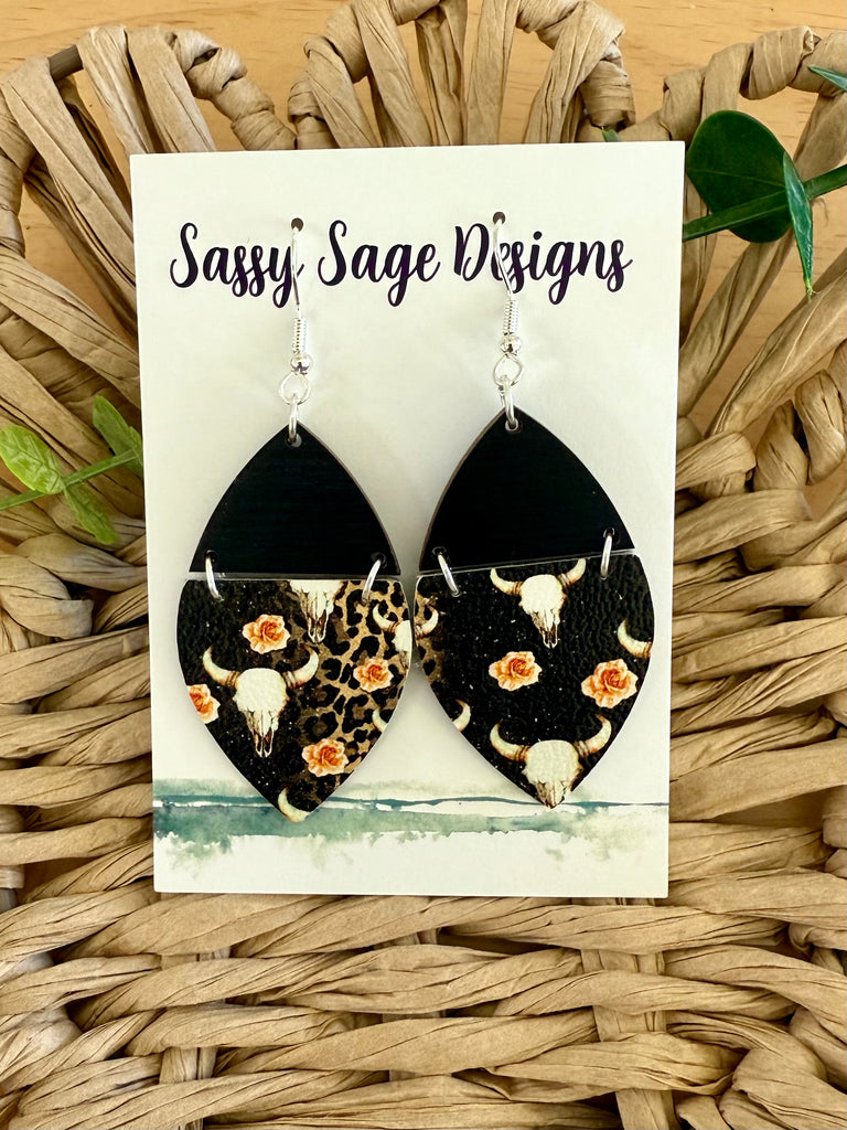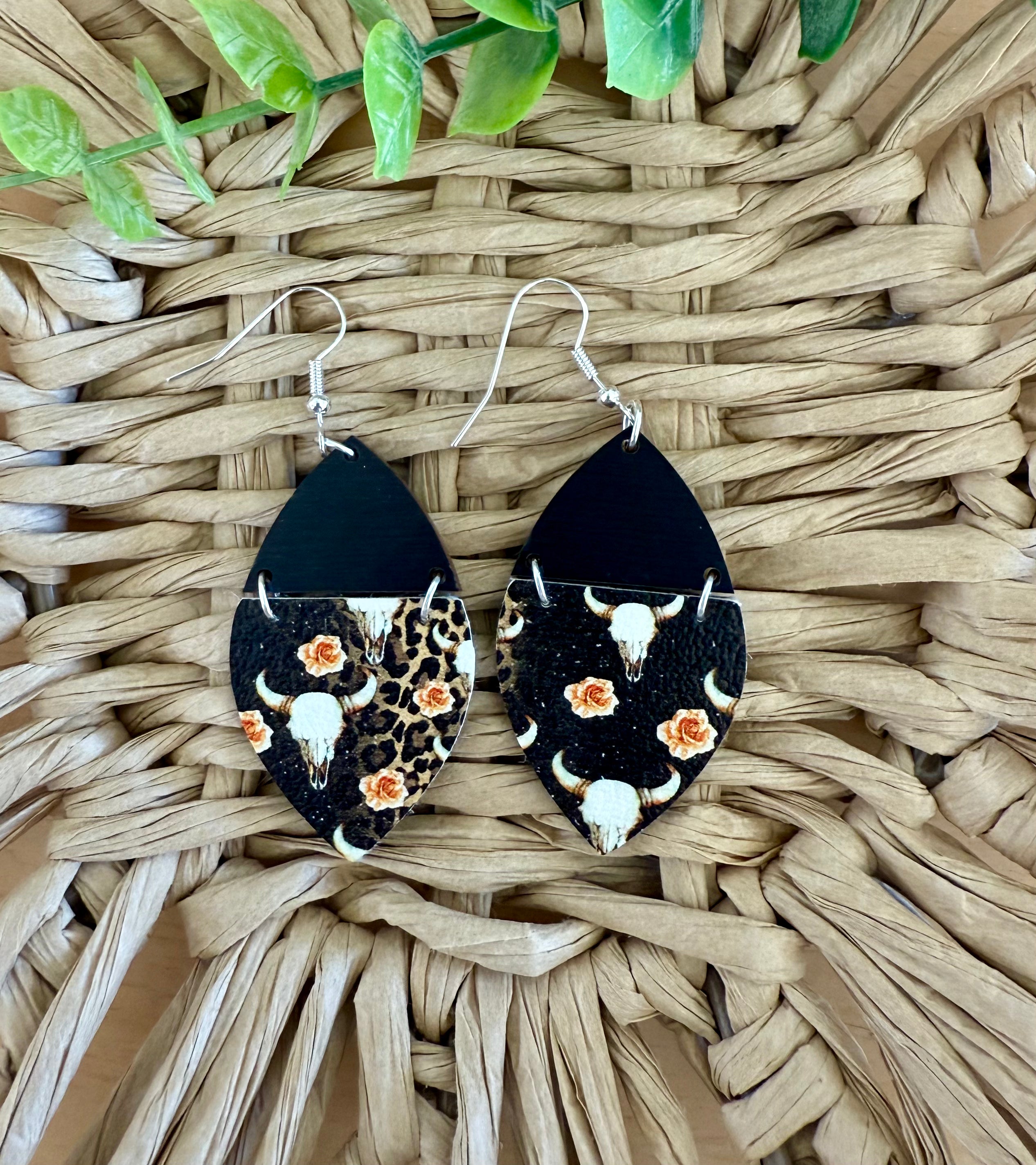 These Steer Faux Leather Dangles combine western and boho elements for a versatile and stylish look. Made with high quality faux leather, they feature a chic black color and delicate floral accents. Elevate any outfit with these unique and sophisticated statement earrings.